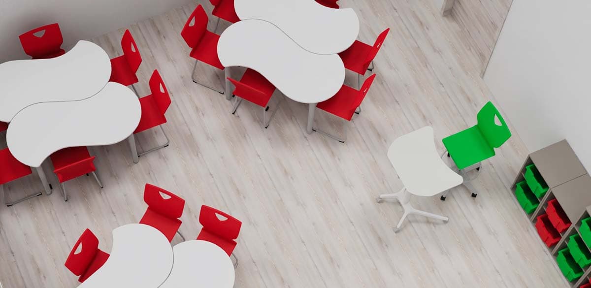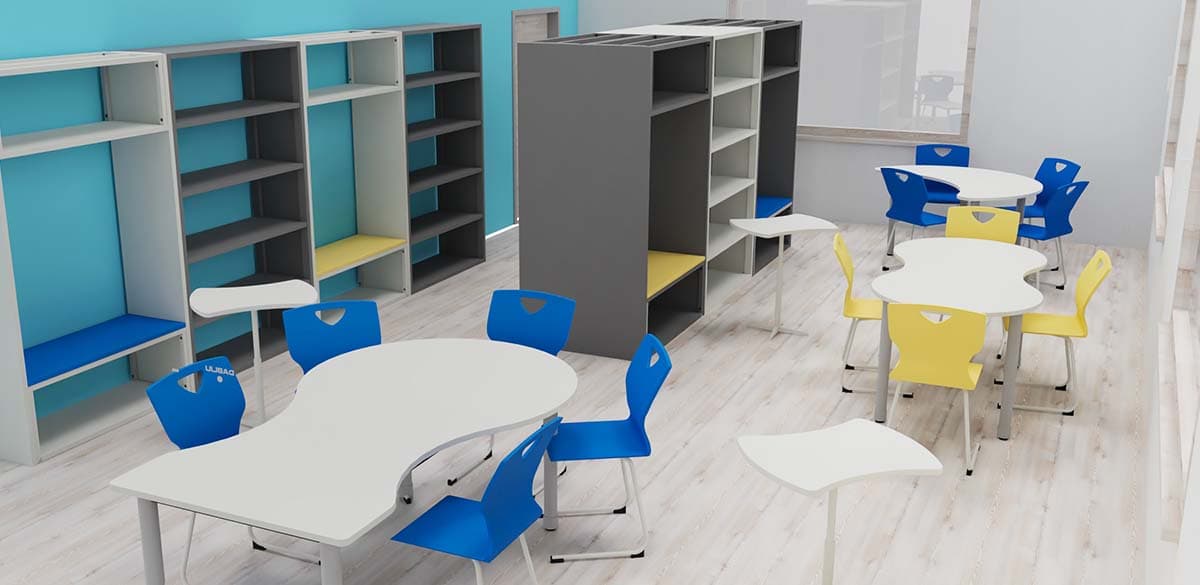 Per l’aula STEM abbiamo creato postazioni con un’ampia superficie che incoraggiano condivisione e collaborazione e nello specifico quattro isole da sei posti; in questo ambiente l’insegnate utilizzerà un leggio mobile, abolendo così frontalità e gerarchia e assumendo un ruolo più di moderatore e consulente.